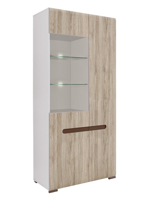 2 распашные двери, левая со стеклянной вставкой (стекло – закаленное, бронзовое), за которой расположена 3 полки из ДСП и 2 стеклянных полки (стекло прозрачное), правая – глухая, за которой расположены 4 полки из ДСП;