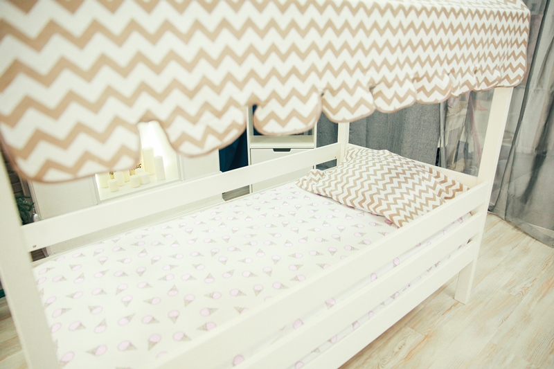 Под заказ можно дополнить домик кроватку аксессуарами: балдахин на крышу, комплект постельного белья, комплект шторы (2 шторы + 2 завязки)