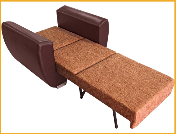 Современный молодежный стиль. При трансформации требуется небольшое расстояние между стеной и спинкой кресла- кровати. В разложенном виде фполучается ровное односпальное место. В основании спинки и сиденья деревянная рамка, на которую кладется эластичный пенополиуретан. Кресло- кровать комплектуется съемной приспинной подушкой из формованного пенополиуретана. Механизм раскладки"Юниор". Чехол у подушки съемный.