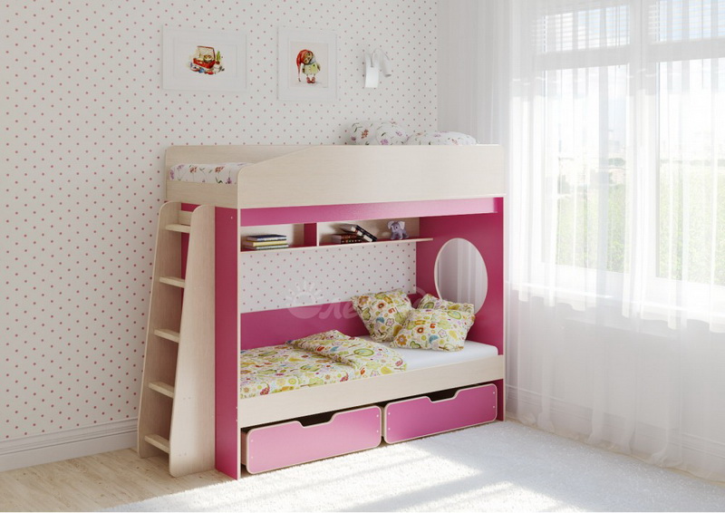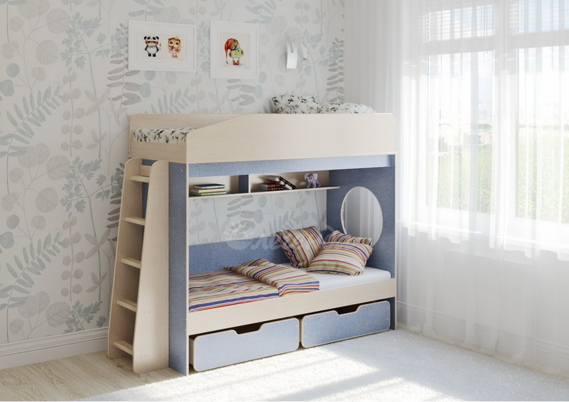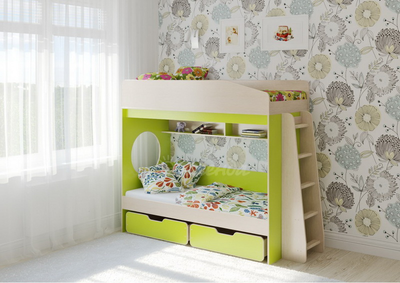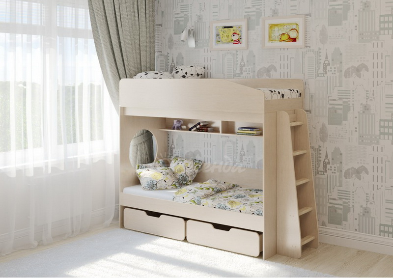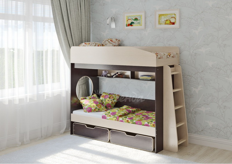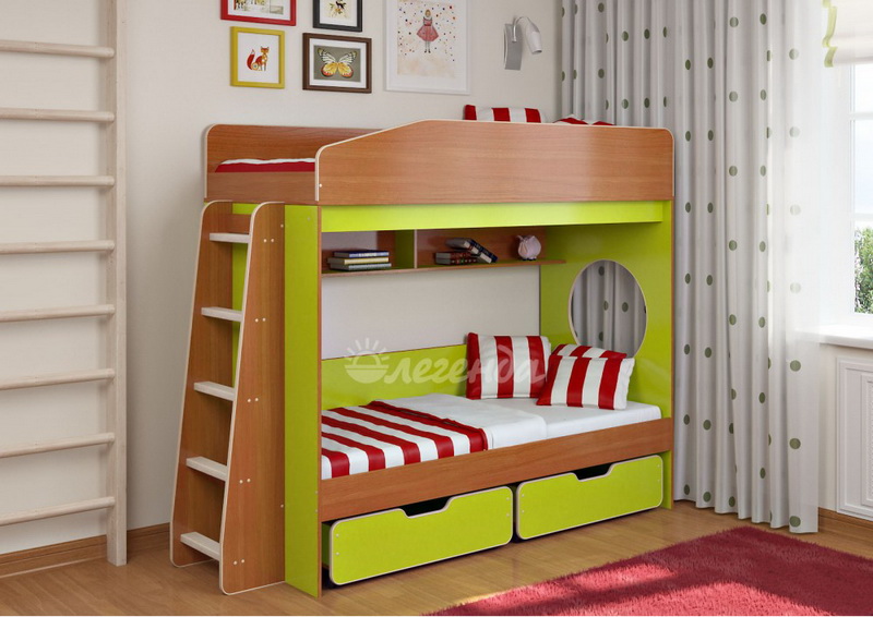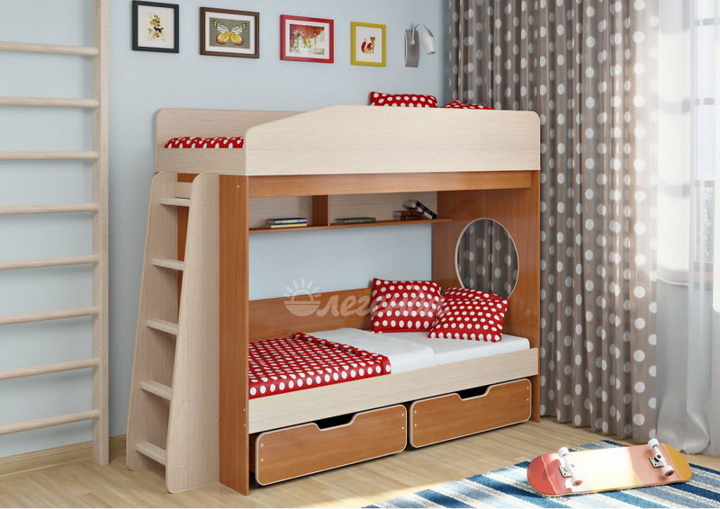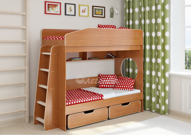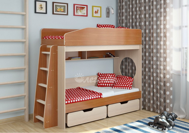 Над нижним спальным местом располагается встроенная двухсекционная полка,в которой удобно хранить книги,учебники,тетради,канцелярию и другие нужные вещи.