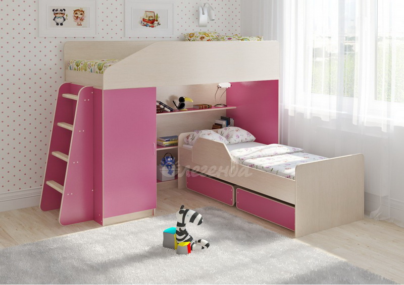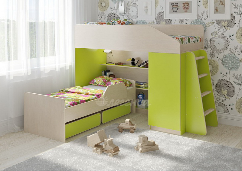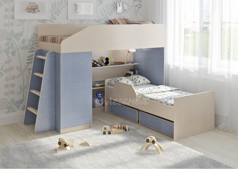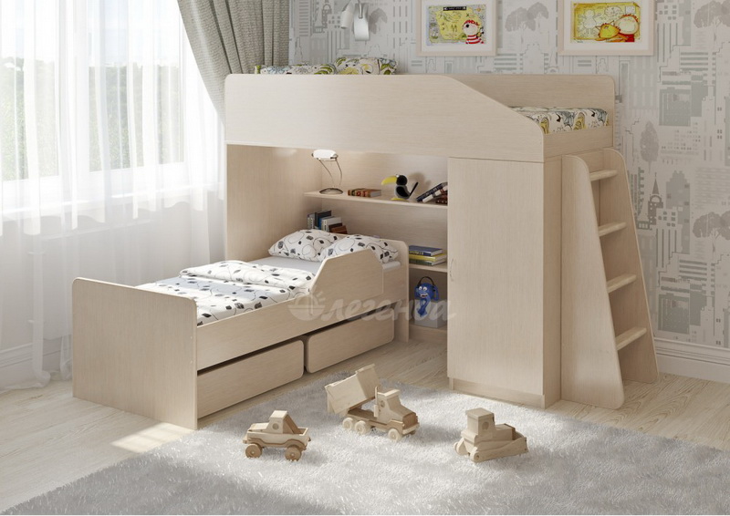 Под верхним спальным местом располагается стеллаж,состоящий из трех полок.Стеллаж отлично подходит для хранения игрушек,удобен для поддержания порядка и сортировки предметов.