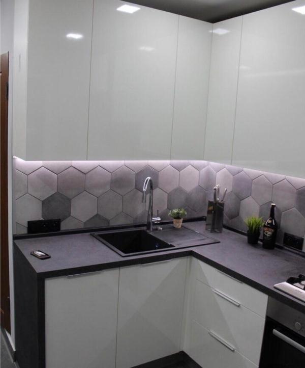 К кухне можно заказать фартук (мебельный щит) ХДФ с фотопечатью, стекло с фотопечатью либо фартук в цвет столешницы.