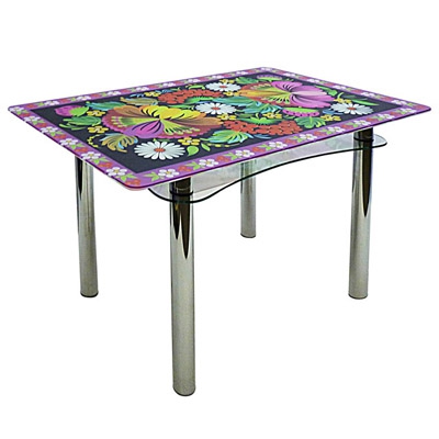 Стеклянный стол для кухни, модель Ян 1. Столешница стекло триплекс с фотопечатью изображения, артикул изображения (rus3). Полка прозрачное стекло.
