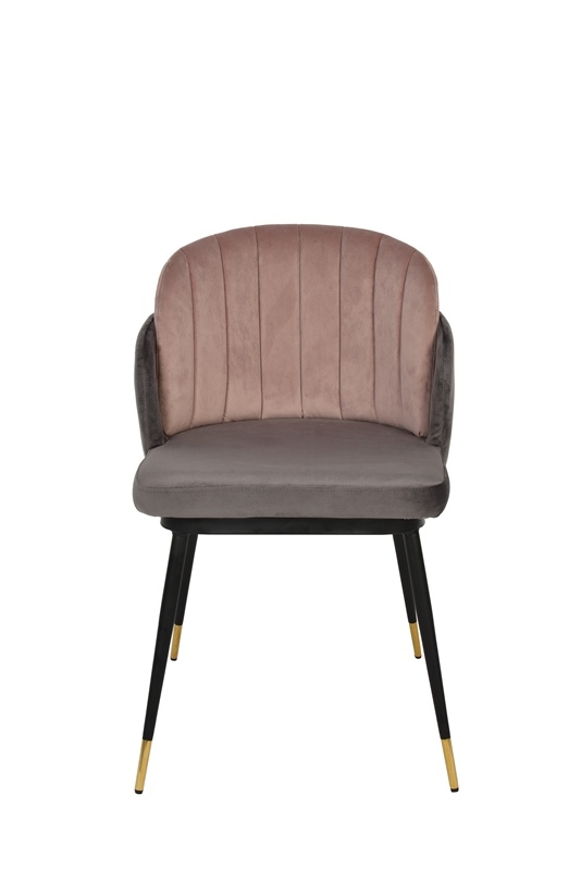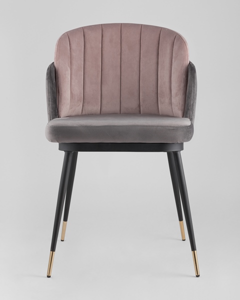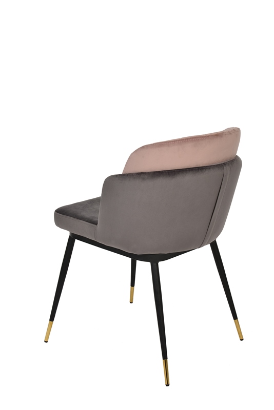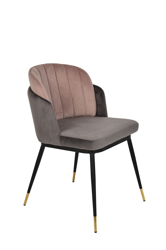 Мягкий двухцветный стул с обивкой из вельвета. Надежная опора достигается благодаря металлическому каркасу и удобным устойчивым ножкам, украшенным золотом. Спинка состоит из двух элементов, внутренняя часть с красивой вертикальной строчкой.