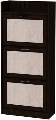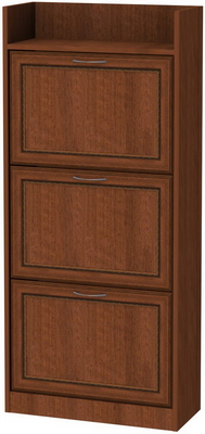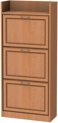 Мы представляем Вам одну из моделей тумб для обуви. Эта тумба имеет три отделения с откидывающимися дверцами. Внутри каждое из отделений разделено еще на два, при помощи дополнительной полочки. Особенностью этой модели является большая вместимость при условии максимальной экономии пространства. Ведь она использует полезную площадь не в ширину, а в высоту. Поэтому ее можно ставить даже в небольшой прихожей или в коридоре. Вверху тумба оснащена дополнительным отделением, предназначенным для хранения обувной косметики, каких-либо приспособлений для ухода за обувью и прочими мелкими аксессуарами. Но Вы можете ставить туда, например, сумочку, или то, что считаете необходимым.