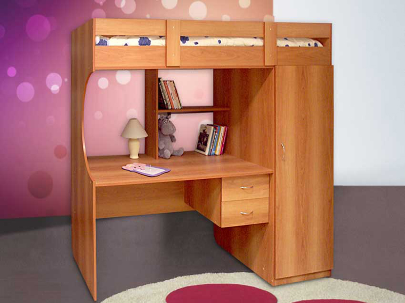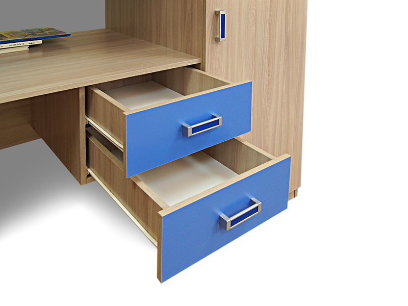В комплектацию уголка школьника №2 входит шкаф, письменный стол с выдвижными ящиками и кровать, что делает его максимально функциональным. Традиционные цвета исполнения позволяют легко сочетать эту модель с другой мебелью в комнате, а габариты легко вписываются даже в небольшую комнату.